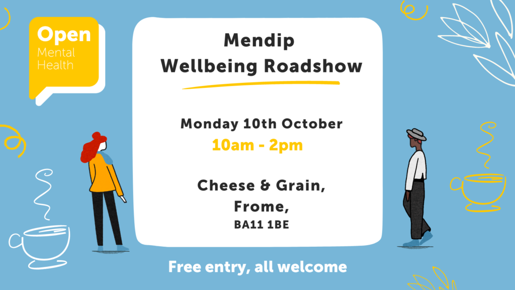 Are you in the Mendip area of Somerset and would like to know more about mental health services available to you and your community? On the 10th of October 2022, Open Mental Health is organising a Wellbeing Roadshow to take place at The Cheese and Grain in Frome, Somerset. There will be some bites to eat, something to drink and an arts exhibition featuring local artists. Learn more about us and what we do. All welcome! |