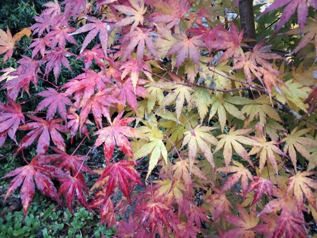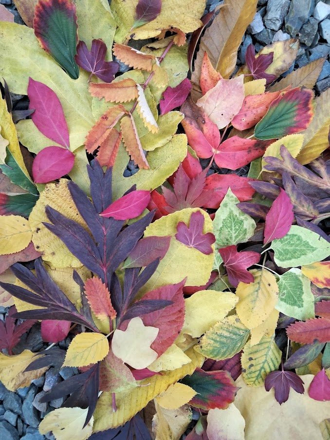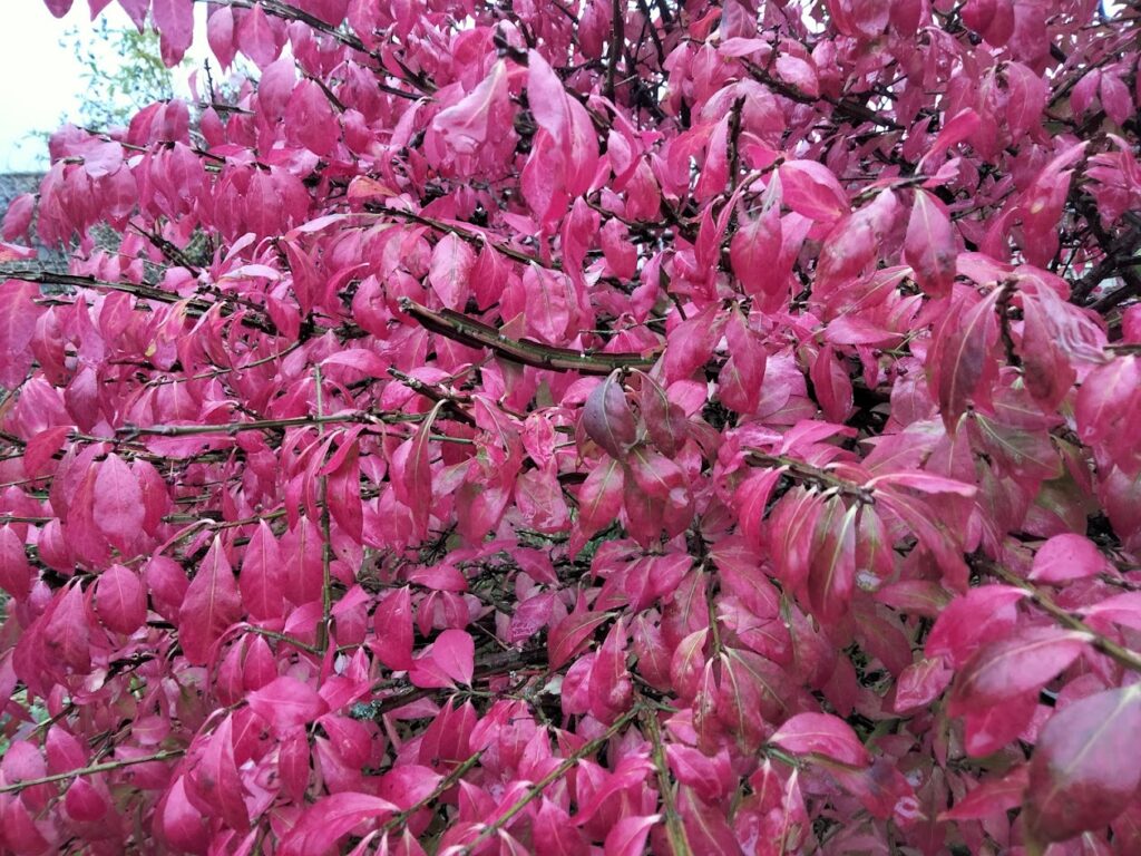 In some of our deciduous trees and shrubs the sugars get trapped within the leaves and these trapped sugars create fiery reds and purples. The more intensity of trapped sugars the more purple the leaves can get. The pigment that causes reds and purples is a pigment called Anthocyanins.