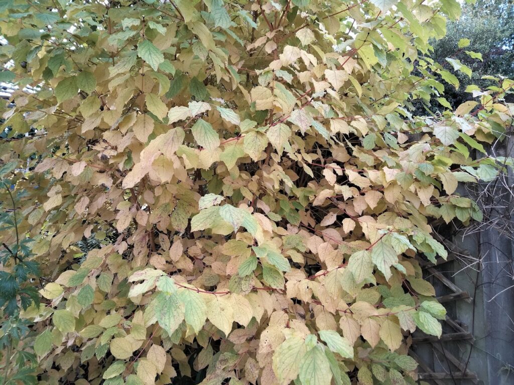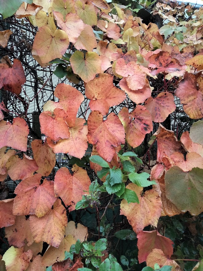 There are some climbers that we are familiar with like Virgina creeper or Boston ivy both turning rich reds. There is also a marvelous climbing Hydrangea that turns white and gold before the leaves drop. Then there is a rather large grape, Vitis coignetiae with its impossible large oval leaves turning from yellow through orange in to fiery reds.